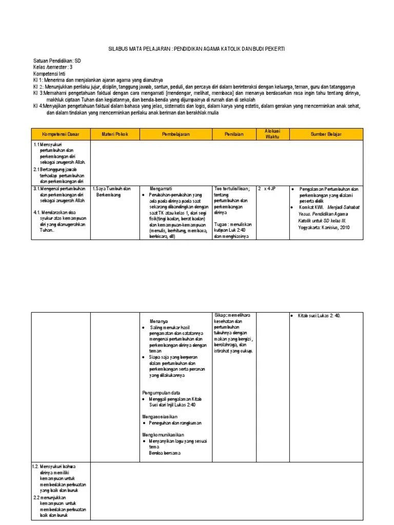 Jan 26, 2021 · silabus pendidikan agama katolik dan budi pekerti sd versi 140216 . Menerima dan menjalankan ajaran agama yang dianutnya ki 2 : Menerima dan menjalankan ajaran agama yang dianutnya ki. Buku paket "bersahabat dengan yesus" pendidikan agama katolik sekolah dasar kelas iii, penerbit "bina media perintis" . Iii (tiga) kompetensi inti ki 1 :